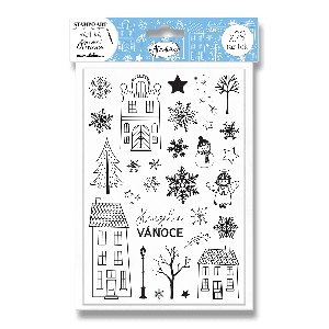 Originální gumová razítka s motivy domečků a sněhových vloček.