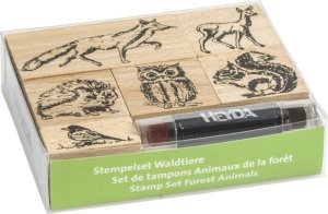 Sada 7 ks dřevěných razítek s motivem lesních zvířátek.