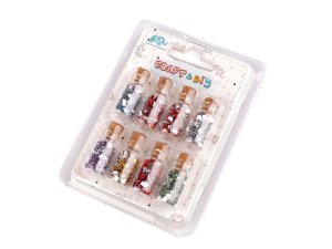 Sada 8 skleněných lahviček s mini plastovými kamínky se hodí na dozdobení mozaiky, nalepení na přáníčka apod.