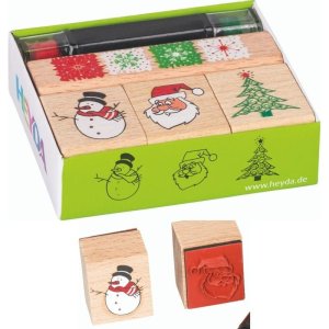 Sada obsahuje 4 kusy gumových razítek na dřevěném špalíku a 2 razítkovací polštářky (zelený a červený).