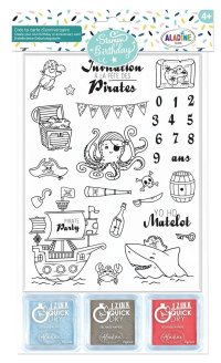 Set obsahuje 28 kulatých razítek s písmeny a diakritikou, 3 čtvercová razítka s obrázky a linkovaný sešit ke psaní a malování.