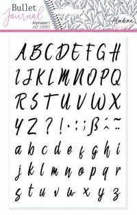 Sada 28 dětských razítek se všemi písmeny abecedy a dvěma znaky a razítkovací polštářek černé barvy.