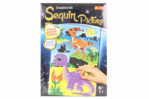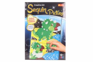 Sada obsahuje předlohu s motivem dinosaurů, sadu flitrových doplňků a hřebíčku pro snadnou aplikaci a ilustrovaný návod krok za krokem.
