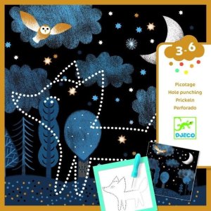 Obsah: 1 držák vyrobený z pěny a silného kartonu pro udržení listů na místě, 16 ilustrovaných pozadí, 16 šablon, 1 děrovací jehla, 1 sešit s návodem krok za krokem.