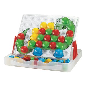 Mozaika pro mladší děti. Obsahuje 48 knoflíků O 3 cm v celkem 6 barvách, 8 vzorových oboustranných karet a transparentní desku s otvory v inovovaném designu s rukojetí pro snadné přenášení.