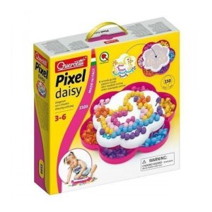 Velká děrovaná hrací deska ve tvaru kopretiny a přihrádky na jednotlivé kolíčky – to je vše, co potřebujete k vytváření nekonečného počtu mnohobarevných obrázků.