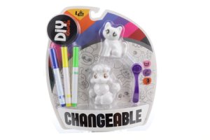 Balení obsahuje 2 zvířátka z plastu-kočičku a pejska, štěteček a 3 fixy.
