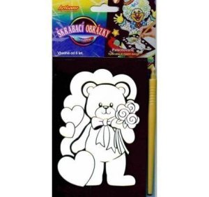 Sada obsahuje obrázek natištěný na černém kartonu a umělohmotné škrabací pero.