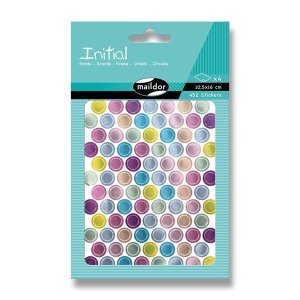 Samolepky Maildor Inital s různými barvami a velikostmi koleček.