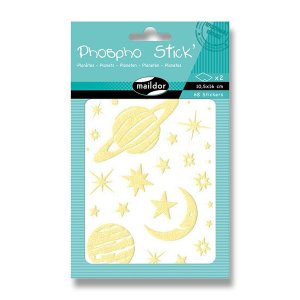 Samolepky Maildor Initial Phospho s motivy planetek v třpytivém a ve tmě fosforeskujícím provedení.