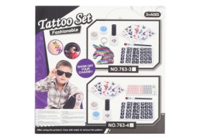 Tetování s fixami set. Balení obsahuje 4 tetovací fixy, tetovačky, kamínky, houbičku, štěteček a flitry.
