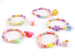 Dětská sada roztomilých šperků z plastových korálků s perlovým leskem obsahuje náramek a prstýnek.