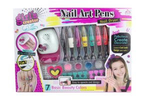 Balení obsahuje sušičku na nehty, 3 barvy laku na nehty, čirý vrchní lak, zásobník na ozdoby, zdobící tyčinka na nehty, samolepky na nehty, pilník na nehty, návod.