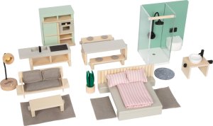 Rozměry postele: 16x14x6 cm Rozměry sprchového koutu: 15x9,5x16 cm Rozměry vysoké skříně: 10x5x12cm Věk: 3+ Materiál: dřevo, látka, kov, plsť Obsahuje 26 dílů