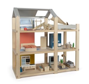 Rozměry: 44x63x35 cm Rozměry balení: 64,5x44x12 cm Věk: 3+ Materiál: vysoce kvalitní dřevo z udržitelných a obnovitelných zdrojů Ručně domalováváno ekologickými barvami Obsahuje 37 ks nábytku
