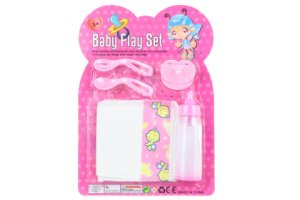 Sada doplňků pro panenky obsahuje lahvičku na pití, plenku, dudlík a příbor.