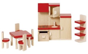 Glorie jídelní stůl obsahuje velký plastový stůl o rozměrech cca 28,5 x 10 x 18 cm, 6 židlí (dvě s područkami) 14,5 x 7 x 5,5 cm.