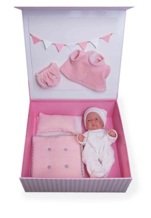 Ručně vyrobená realistická španělská panenka s celovinylovým tělem a vlásky po celé hlavě.