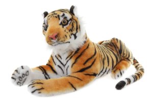 Plyšový hnědy tygr o velikosti cca 55 x 28 x 18 cm (bez ocasu), délka ocasu cca 37 cm.