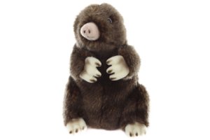 Plyšový krtek sedící o velikosti cca 18 x 18 x 10 cm.