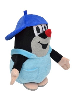 Sedící plyšový Krteček s rošťáckou kšiltovkou.