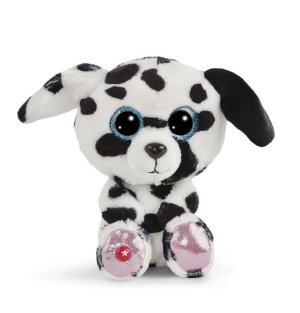 Glubschis Plyšový Dalmatin Dottino 15 cm vás okouzlí svým hebkým kožíškem v bílé barvě s černými puntíky, modrýma třpytivýma očima a lesklými prvky na jeho malých chodidlech.