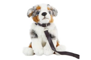 Plyšový australský ovčák s vodítkem o velikosti cca 23 x 20 x 16 cm.