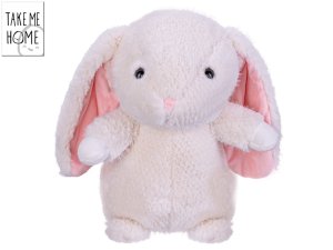 Plyšový zajíc o rozměrech 21x15x15 cm.