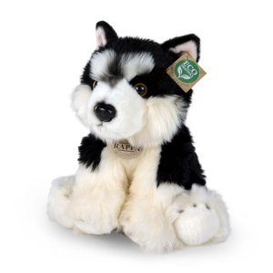 Plyšový pes husky o velikosti cca 15 x 16 x 11 cm.