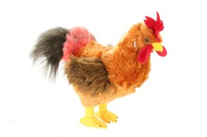 Plyšový kohout o rozměrech cca 31 x 37 cm.