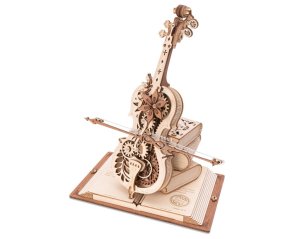3D dřevěný mechanický model - kouzelná hrací skříňka na klíček ve tvaru kouzelného violoncella s pohybujícím se smyčcem.