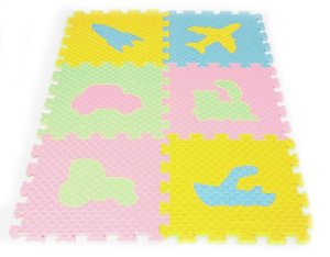 Pěnový koberec s vyjímatelnými dílky dopravních prostředků v pastelových barvách je omyvatelný, tlumí hluk a izoluje od chladu.
