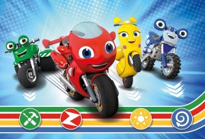 Dětské deskové - rámkové puzzle, které se skládá přímo na přiloženou podložku s rámečkem s motivem animovaného seriálu Mickey a závodníci .
