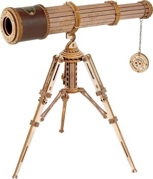 3D dřevěný model monokulárního dalekohledu ze série ROBOTIME Rokr Curious Discovery , který lze používat se stativem nebo bez něj.