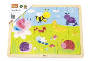Veselé dřevěné puzzle s motivem lučních zvířátek.