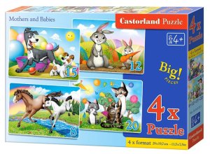 Čtyři progresivní puzzle pro malé děti s různou obtížností - 8 dílků, 12 dílků, 15 dílků a 20 dílků.