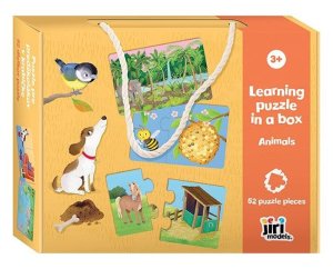 Krabička obsahuje 26 barevných puzzle kartiček s různými motivy, díky nimž se děti učí poznávat zvířátka a ještě si jejich skládáním procvičují jemnou motoriku.