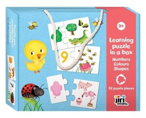 Krabička obsahuje 26 barevných puzzle kartiček, díky nimž se děti učí poznávat barvy, tvary i čísla a ještě si jejich skládáním procvičují jemnou motoriku.