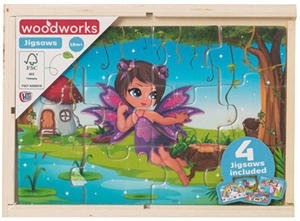 Čtyři samostatné dřevěné puzzle po 12 dílcích v dřevěné krabičce s víkem.