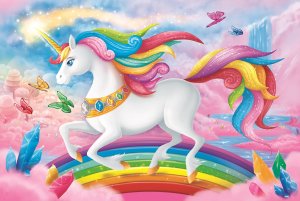 Krásné barevné puzzle s motivem jednorožce obsahuje 100 dílků, velikost složeného obrázku 41 x 27,5 cm.Rozměry balení 29 x 19 x 4 cm.Vhodné pro děti od 5 let.