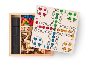 Soubor stolních her v dřevěném boxu, jehož víko tvoří oboustranná hrací deska pro jednotlivé společenské hry (šachy, dáma, člověče, nezlob se).
