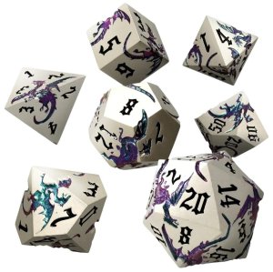 Kartáčované starozlaté kostky s černými rytinami draků na každé stěně.