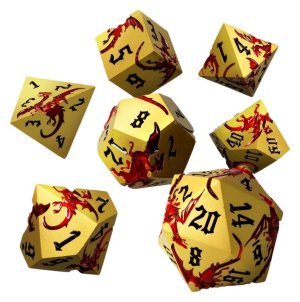 Teplé zlaté kovové kostky s ručně malovanými červenými draky na každé stěně, každý zachycený uprostřed letu nebo v mohutném řevu.