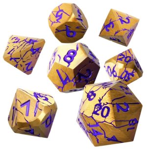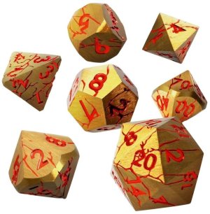 Tyto kovové kostky mají zlatý povrch s jemně kartáčovanou texturou a popraskané hlubokými červenými prasklinami, jako by se z nich chtěla vymanit nějaká skrytá energie. Červená čísla mezi prasklinami …