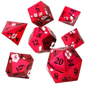Tmavě karmínové matné kovové kostky s bílými květy třešní a černými větvičkami mezi čísly.