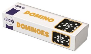 Stolní hra se sadou dominových kamenů o rozměrech 20x40 mm v krabičce.