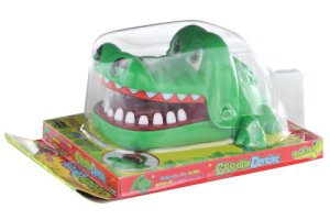 Zábavná potřehová hra. Krokodýl otevře tlamu a děti se střídají a postupně zatlačují jeho zuby.