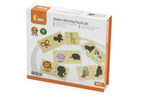 Dřevěné pexeso. Cílem hry je najít obrázek zvířátka a k tomu stín.