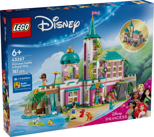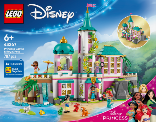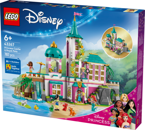 Děti a fanoušci studia Disney objeví kouzelný svět se stavebnicí LEGO® | Disney (43267) Hrad princezen a královští domácí mazlíčci. Tento hrad pro kluky a holky od 6 let obsahuje pokoj pro každou princeznu a poslouží jako krásný dárek. Hrad můžetevystavit zavřený a najdete v něm spoustu doplňků a funkcí, včetně luku, tunelu s vodopádem, odnímatelného nábytku a spoustu dalších. Stavebnice obsahuje 5 minipanenek LEGO | Disney: Ariel, Lociku, Mulan, Jasmínu a Vaianu. Nechybí také 5 zvířecích posta v LEGO | Disney: Šupinka, Pascal, Rádža, Pua a vůbec poprvé také Mushu. Tato stavebnice Disney Princess představuje zábavný dárek pro holky a kluky, které s ní čeká nekonečné hraní. Model můžete zkombinovat s dalšími stavebnicemi LEGO | Disney z této řady (všechny se prodávají samostatně). Díky aplikaci LEGO Builder můžou děti navíc stavět společně s kamarády a rodinou a užít si společný stavitelský zážitek. Stavebnice obsahuje 787 dílků.