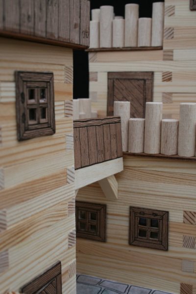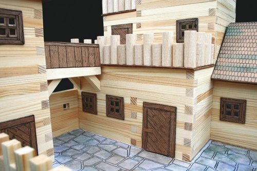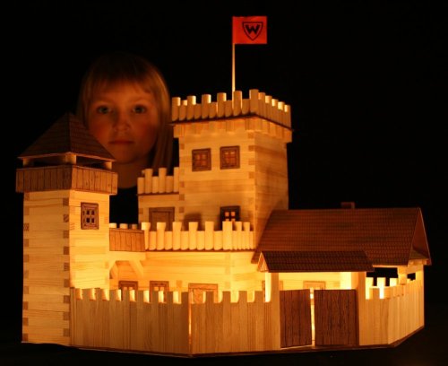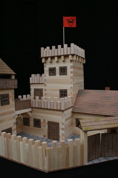 Dřevěná stavebnice Walachia ke slepení - Hrad. Slepovací stavebnice Walachia jsou dřevěné modely domečků a staveb z Valašského kraje v měřítku 1:32. Základem jsou dřevěné hranolky 9x9 mm a k tomu jsou v sadě vždy všechny papírové doplňky - okna, dveře, střešní části atd. Pro lepení se používá lepidlo Herkules, není však součástí stavebnice. Přiložený je montážní návod a malé kapitoly z historie lidové architektury. Níže je označení obtížnosti číslem 1 - 5, přičemž 1 je nejlehčí. Počet dílů stavebnice: 607. Rozměry: 53x41x46 cm. Obtížnost: 4